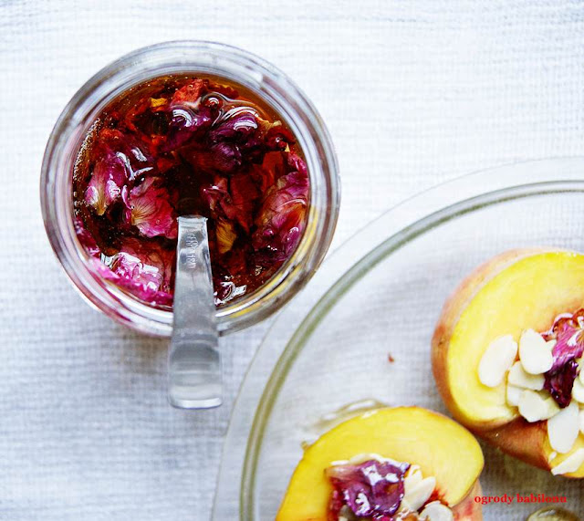 Na zakończenie cudownej akcji kwiatowej pyszne pieczone brzoskwinie z miodem różanym i migdałami. Przepis podpatrzony u Olcik wzbogaciłam o miód różany i płatki. Tak przygotowane brzoskwinie doskonale smakują podane na ciepło z kulką lodów waniliowych i płatkami róż, przepis na nie dodaję do Kwiatowej Książki Kucharskiej oraz Morelkowo Brzoskwiniowo.