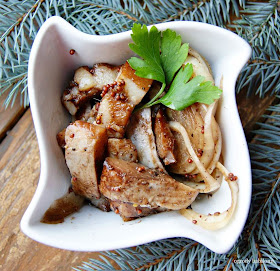 pomarańczowej oraz suszonych fig. Piernik w tym roku przełożony masą daktylowo - pomarańczową, powidłami śliwkowymi oraz pyszną masą orzechową na bazie masła, żółtek i orzechów włoskich, oraz masą marcepanową z mielonych migdałów i jajek z dodatkiem likieru migdałowego.